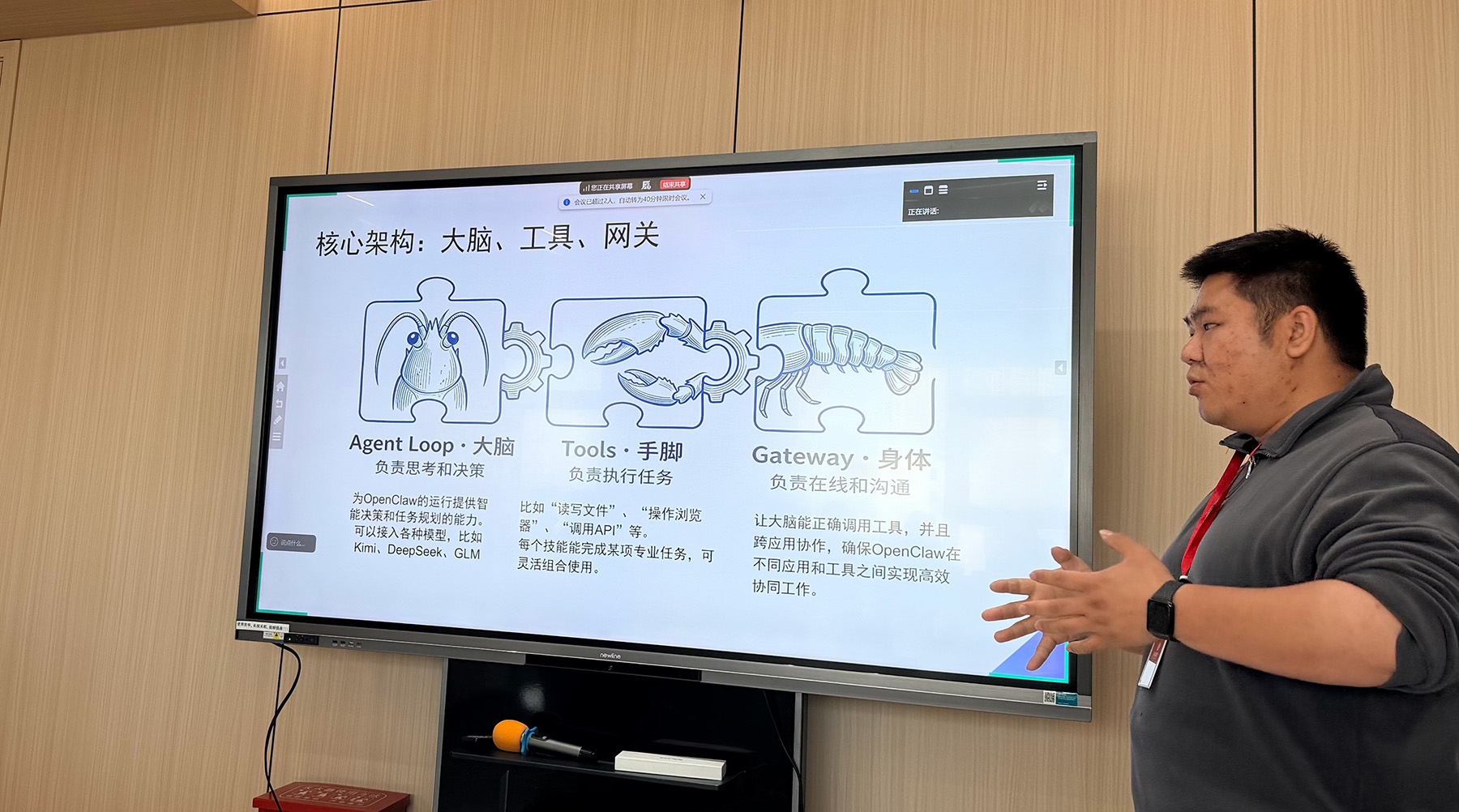 此次全員培訓(xùn),正是集團(tuán)將AI戰(zhàn)略從“高層關(guān)注”推向“全員落地”的關(guān)鍵一步。培訓(xùn)會由集團(tuán)高級工程師楊帥主講,他結(jié)合精心準(zhǔn)備的PPT,深入淺出地講解了OpenClaw與大語言模型的本質(zhì)區(qū)別、核心架構(gòu)、多種部署方式,并通過訂單拆分、物流合并、數(shù)據(jù)分析、記憶陪練等真實(shí)業(yè)務(wù)場景的現(xiàn)場演示,生動展現(xiàn)了AI從“只能動嘴”到“真正動手”的能力躍遷。